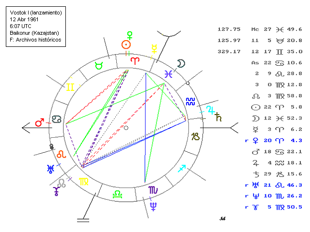 - El ascendente en Cáncer nos da idea de que en los preparativos del viaje hubo un fuerte componente nacionalista. De hecho es difícil precisar qué fue más importante para los soviéticos: el viaje en sí o el hecho de que la URSS hubiera adelantado a los EEUU en la carrera espacial.