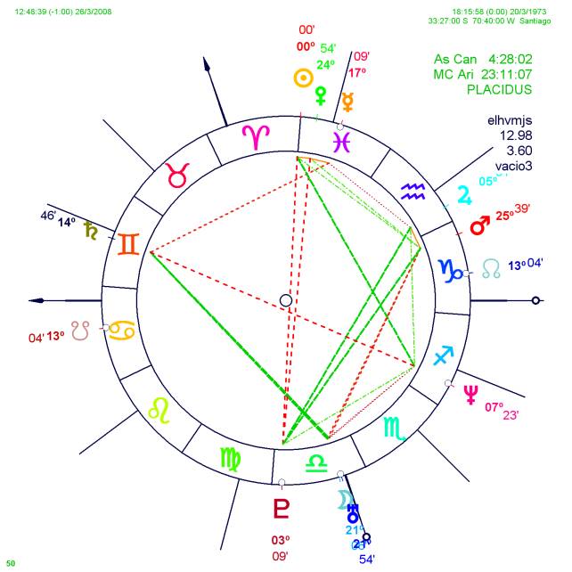 Volviendo al ingreso solar del 73 (parecido a éste), ya hemos visto que aquel año Marte estaba en IV en España (atentado de Carrero Blanco), Reino Unido (atentados del IRA, independencia de las Bahamas) y Portugal (independencia de Guinea Bissau). En cambio, en Chile y Uruguay se hallaba en VII. En ambos países hubo golpe de estado. Veamos la carta para Santiago de Chile:
