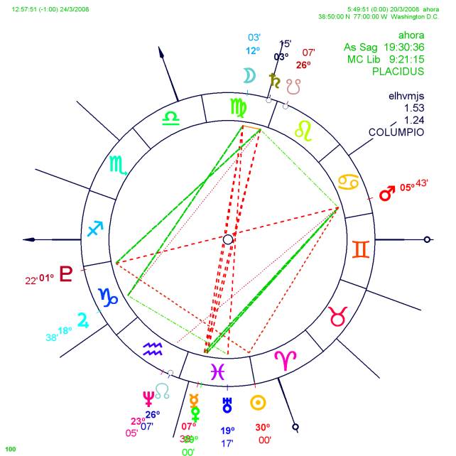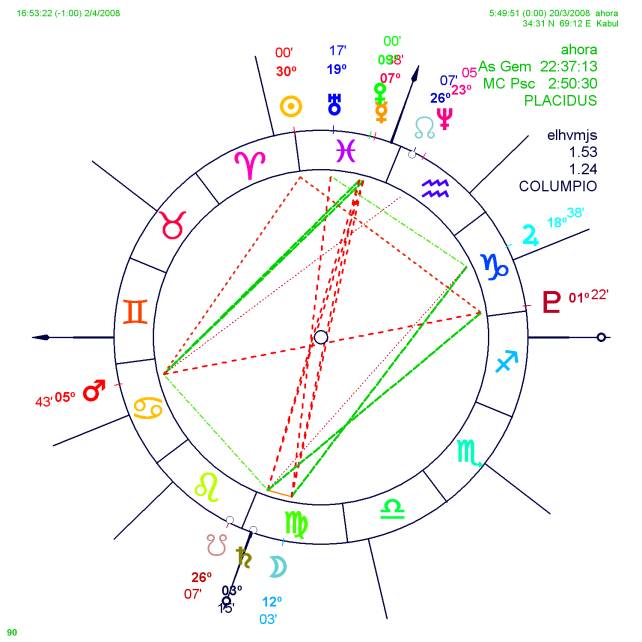 -Por otro lado, como luego veremos al estudiar la carta del ingreso para Kabul, me parece que lo más probable es que la situación en Afganistán o Pakistán se vuelva muy grave, tanto que les causará muchos conflictos. Un Marte en Cáncer es un Marte nacionalista. Sea cual sea la religión de los enemigos, ése no es su acicate principal.