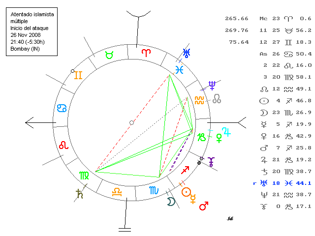 múltiple en Bombay Comandos armados llegan en balsas neumáticas y toman edificios emblemáticos de la ciudad Inicio del ataque: at261108.GIF . Marte es PUMA, está únicamente mal aspectado (acontecimiento violento, desastroso, destructivo), como podemos observar en el gráfico del cielo local: La Luna (en caída en Escorpio, gobernado por Marte. La Luna es el propio regente del AS (la naturaleza delacontecimiento). Por su simbología (las masas humanas), sería un buen indicador del número de víctimas; los aspectos armónicos son separativos, y de estos, los de los maléficos son de poca ayuda, tan sólo el sextil separativo al benéfico Júpiter. Por el número de personas involucradas (creo que todo el centro de la ciudad), ha habido pocas víctimas (creoque sólo algún que otro centenar). Este sería el aforismo investigado en http://www.astralis.es/articulos/puma2.htm :