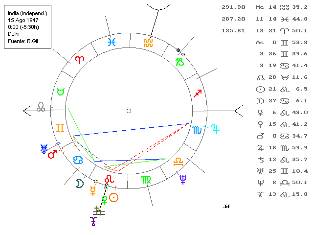 En otro orden de cosas, en la carta del atentado, la conjunción Sol-Mercurio-Marte, violenta y únicamente mal aspectada, está en conjunción al DS de la carta de la Independencia de la India (enemigos declarados). Sergio Rivillo |