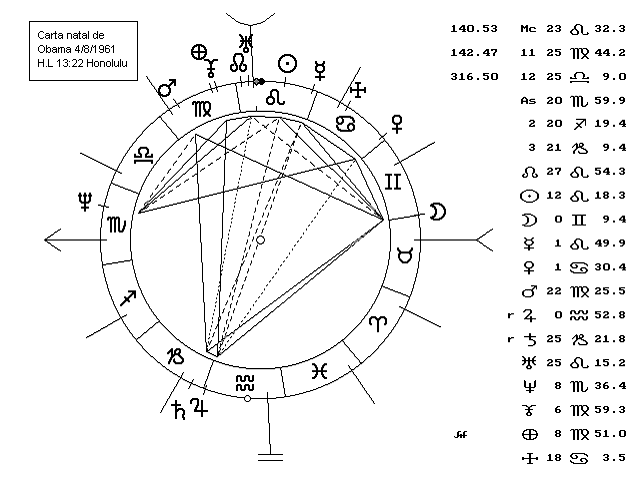 Hubiera sido más fácil trabajar con una carta natal asegurada o consensuada, pero al parecer aún pesa sobre nosotros, los astrólogos, una condena que nos divide. De las distintas horas de nacimiento de Obama me inclino por la hora que sitúa su Sol en la Casa IX, es decir por la que no se corresponde con la partida de nacimiento que circula en Internet. En la vida hay que tomar decisiones que pueden ser arriesgadas. |