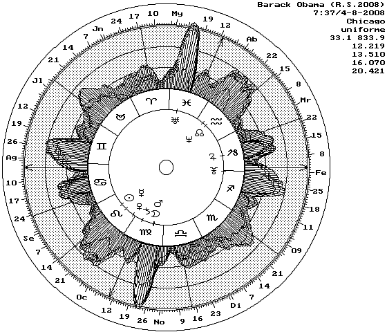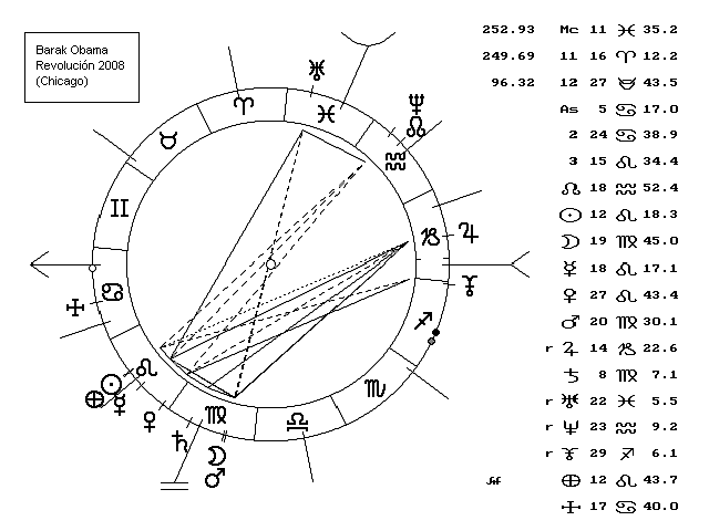 ¿Pero ganará Obama o no las elecciones presidenciales? Si, las ganará, ganará sin duda las elecciones, hay argumentos astrológicos muy claros y razonables que así lo indican, incluso me da que pensar sobre la posibilidad de que Obama disponga de un gabinete de astrólogos que lo asesoren, pues al cumplir años en Chicago, el Parte de Fortuna se sitúa exactamente sobre su Sol. Parece que hayan usado la antigua costumbre mesopotámica de relocar al emperador.
