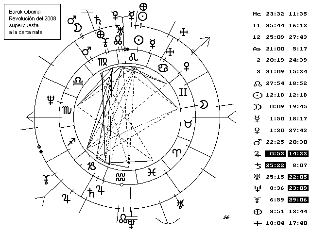 Lo más destacable a simple vista de la revolución solar del 2008 de Obama es la conjunción de la Luna con Marte. Se trata de una conjunción inarmónica sobre la que pesa una oposición de Urano. -Cuando llegue finales de octubre podremos saber de verdad de que se trata y si la carta propuesta de Obama es la correcta, entonces el Ascendente progresado llegará al lugar de la conjunción Luna Marte oposición Urano y sumará más de 30 astrodinas, lo que significa un cambio en el rumbo en el año de Obama.