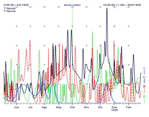 Utilizaré un gráfico de harmogramas compuestos por los ritmos de los armónicos 12, 16, 7 y 1 y los planetas Mercurio, Júpiter, Saturno, Urano, Neptuno y Plutón.
