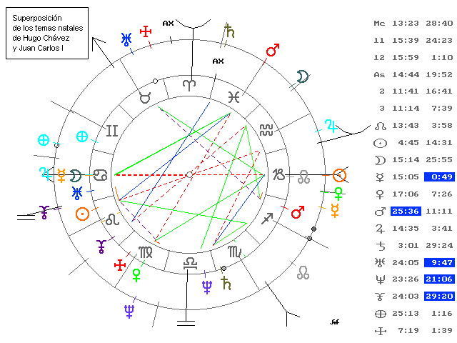 Si el Nodo Norte está en la cúspide de VII de Chávez, el Nodo Sur está justo en su Ascendente, junto a la triple conjunción. El Nodo Sur en el Ascendente habla de un “punto fijo en el carácter, una forma de hacer las cosas, que puede rayar en la manía, unas costumbres extrañas que tratan de imponer a los demás..............a causa de experiencias vividas en la juventud o en la niñez” En el caso de Chávez la influencia del Nodo se multiplica por cuatro a causa de su conjunción con los planetas del Ascendente, quizás por ello sus manías, paranoias y estulteces son tan ricas y expresivas. Tendremos tiempo de ir desvelando una a una todas sus próximas “creaciones”. Lo que queda claro de esta situación activada por el paso de Marte opuesto al Sol de SM el Rey de España, es que Hugo Rafael Chávez lo siente como su enemigo, lo considera cómplice del golpe de estado del 2002, el rey es su enemigo natural, el que le cierra la puerta, el que le cierra el paso a la gran alianza que bulle en su alterada mente. El planeta Júpiter del Rey de España está opuesto al Sol de Chávez, el sentido de justicia de D Juan Carlos se enfrenta a la arrogancia del caribeño grosero. Este incidente ha servido para dejar las cosas en su sitio ahora Chávez tiene dos nuevos oponentes naturales, el Rey de España y Zapatero, que se mostró con el esplendor y la generosidad propia de un Leo con dignidad. Tito Maciá,