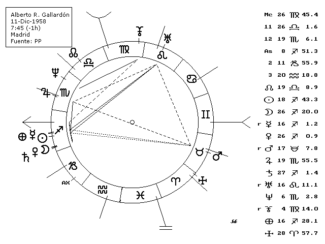 Alberto Ruiz Gallardon nace con el Sol en Sagitario, Ascendente en Sagitario, Mercurio en Sagitario y la triple conjunción Luna, Venus y Saturno igualmente en Sagitario y en la Casa I. El planeta Saturno, en este mes de enero 2008, circula por los primeros grados de Virgo y empieza a dejar notar el efecto del haz de cuadraturas de la manera que lo ha hecho. Rajoy, Acebes y Esperanza Aguirre, representantes de la cúpula del PP y por tanto de Saturno, le han cortado el paso en su carrera política. El tránsito de Marte retrógrado por la Casa VII de Gallardón, opuesto a la triple conjunción Venus-Luna-Saturno explican el resto del disgusto y la tensión de la situación. Gallardón a dicho que va esperar hasta ver que pasa después de las elecciones para tomar una decisión. Se avecinan años difíciles para Gallardon y para la derecha española. Los representantes de la derecha se han puesto “duros” se han reforzado en sus posiciones, empiezan a volverse extremistas, se han escorado descaradamente hacia la plutocracia y el capital. El fichaje de Pizarro como número dos en las listas electorales de Madrid, detrás de Rajoy, refuerzan la teoría. Aparte de la ambición de poder, una de las “virtudes” de Plutón está relacionada con la invisibilidad y con hacer desaparecer lo que sea. En este mes de enero 2008 ha entrado en el signo zodiacal de Capricornio y ha hecho desaparecer en pocos días 500.000.000.000 de euros, lo que valen, poco más o menos, todas las viviendas de la Comunidad de Madrid. Ese dinero ya no está, así es la plutocracia. El poder del dinero se enroca, se encierra, se defiende, se enclaustra en el “castillo” y hace desaparecer el capital. La derecha está empezando a usar su poder destructivo paralizando todo lo que puede. No más créditos, intereses más altos, sueldos congelados, disminución de empleos, relocalización empresarial, despidos masivos en las entidades afectadas, como pueden ser las financieras, las inmobiliarias y los servicios. En la mitología griega, que es un repertorio de arquetipos válidos para todos los tiempos, se habla de unas criaturas terroríficas, parecidas a dragones con el cuerpo recubierto de escamas de oro, provistos de vigorosas alas, rostros redondeados, dientes como colmillos, con la lengua fuera y con serpientes en lugar de cabellos, que convertían de piedra a todo aquel que las miraba. Estas horribles y maravillosas criaturas procedían de lo más alejado del océano occidental y les llamaban las Gorgonas. Dos de ellas eran inmortales, mientras que una, Medusa era mortal Estas Gorgonas tienen su reflejo en la realidad del mundo capitalista actual, donde se habla constantemente de unas “entidades” parecidas a dragones recubiertos de escamas de oro como son las “entidades financieras” que proceden del otro lado del océano occidental. Empresas de vigorosas alas que vuelan de país en país buscando extraer beneficios. Entidades que se parecen a la hechicera que ofrece cumplir tus deseos materiales; un piso, un coche, una parcelita en el campo, un viaje de vacaciones, los estudios de los niños, el arreglo de la cocina, lo que tu quieras, tu pides un deseo y la hechicera te lo concede o no. Citygrup es una de las serpientes de la cabeza de la Medusa, una de las “entidades financieras” más importantes del mundo, casi casi se puede hablar del “buque insignia” de la armada capitalista. Cytygoup es como la medusa que está herida de muerte, las escamas de oro no resisten el rozamiento de un aterrizaje económico tan severo como el que estamos experimentando en estos tiempos. Las escamas de oro no eran de oro, sino de plástico, de plástico que procede del petróleo, petróleo que ha sobrepasado el precio de lo que puede costar obtener metanol partiendo de vegetales primarios. El metanol tiene una combustión limpia, sin humo ni residuos de ninguna clase, igual que el gas y dentro de poco será más barato de obtener un litro de alcohol o metanol de combustión, que un litro de gasolina y el gasoleo prcedente del petróleo. Hace pocos días, un Fidel Castro enfermo pero absolutamente lúcido, hablando con Chávez, le advertía del peligro de hambruna para el tercer mundo, lo que significa que se destinen grandes cultivos para la obtención de combustibles. A mediados de enero 2008 se entrevistaba con Lula y le hablaba de lo mismo. Generals Motors de Detroit ha decidido apostar por el nuevo combustible y ha invertido miles de millones de dólares en la empresa Coskata que se dedica a extraer metanol de elementos vegetales que se cultivan en las fértiles llanuras norteamericanas donde antes se cultivaban alimentos. Entra Plutón en Capricornio y Cytigroups parece que se hunde y con ella la bolsa mundial. Han desaparecido en menos de un mes 500.000 millones de euros, se han esfumado, ya no están, no sabemos si estaban, pero de golpe o de momento ha desparecido el equivalente a 1.600.000 viviendas de clase media que cuesten cada una 300.000 euros, esa es la cuenta. Lo que significa que si contamos a cuatro personas por vivienda, se podrían quedar sin casa en los próximos meses 6.400.000 personas, más o menos la población de la Comunidad de Madrid de principios del siglo XXI. El efecto vaciador de Plutón también se va a percibir el signo de Cáncer al que afecta por oposición, vamos a asistir al espectáculo de millones de viviendas vacías y millones de personas en la calle. Esa la venganza saturnina que ahora ya tiene a Plutón, ya tiene el poder, ya tiene agarrados por lo más doloroso a dos tercios de la población activa y ahora, como venganza a la pérdida de las próximas elecciones va apretar con las hipotecas y los créditos y mucha gente va a tener que renuncias a muchas cosas. Pero también con el paso de Plutón en Capricornio van a desaparecer cada una de las personas que se han beneficiado del bochornoso negocio que se ha montado en los últimos años con la sobre valoración de la