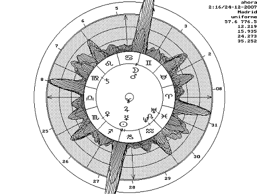 Quizás esta representación clásica no llame la atención de quienes no están habituados a mirar este tipo de configuración, sin embargo en el gráfico de Astrodinas si se puede observar algo excepcional en este tiempo, aunque no se realice este tipo de observación habitualmente, pues la onda de astrodinas rompe el gráfico denotando su excepcionalidad. ¿Qué sabemos seguro sobre la influencia de las sizigias, es decir de los alineamientos del Sol, la Luna y los planetas? En esta ocasión el Sol está en una declinación 23 sur mientras que la Luna está en 27 norte, cuando hay Luna llena y además alineamiento es cuando ocurren intensas mareas vivas en determinadas zonas del mundo, el nivel del agua del mar puede aumentar, en según que costas marinas, más de ocho metros de altura. La Luna de Nochebuena pasa muy