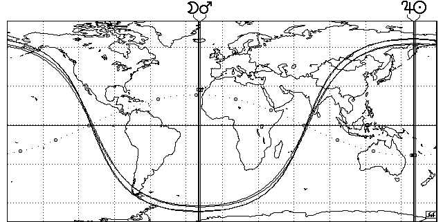 mínima, colma el vaso y se sale el agua. Sea como fuere, vamos a aprender algo sobre esta influencia pues en esta ocasión esta ocurriendo en unos días del año en los que se deciden las corrientes oceánicas. Son estos tres primeros días del Sol en Capricornio cuando en las costas sudamericanas, la corriente se inclina hacia el este o hacia el oeste, Niño o Niña. Esta especial Luna llena, que traerá mareas vivas, empujará la corriente hacia el oeste provocando con bastante probabilidad grandes lluvias en Australia, Indonesia, Indochina, Japón y China, mientras que en este otro lado del mundo podríamos tener un invierno seco. Pero este es un tema para los hombres del tiempo. El efecto astrológico de esta Luna llena puede ser muy interesante, hace muchos años que no tenemos una Luna llena en Navidad, la última vez fue en 1988, pero no en estas condiciones, en las que dos planetas importantes entran en juego en la configuración. ¿Pero, en qué lugares del mundo debería tener mayor influencia? Si seguimos el protocolo de dar mayor importancia a los lugares donde esta configuración es angular, podemos indagar usando el grafico de astrocartografia en el que se observan cuáles son estas zonas.