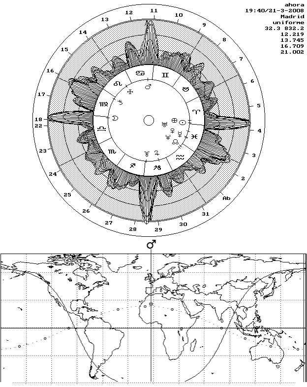 La primera Luna llena, estando el Sol en Aries, señala el tiempo de la Pascua, de la Pascua judía, el tiempo del “echarse a andar” de salir de Egipto y liberarse de la esclavitud, un tiempo atávico de los antiguos pueblos pastores que se libraron del matriarcado allá por los tiempos de Abraham, un tiempo que aprovechó el Nazareno para expresar su protesta, un tiempo que mezcla y combina las tradiciones, un tiempo que rememora la pasión de Jesucristo, su renacimiento y la liberación de un pueblo, un tiempo cruce de caminos en el tiempo, que este año 2008 colisiona directamente con la Fallas valencianas que son unas fiestas paganas de primer orden. Esto se produce a causa de que el Sol está en el primer grado de Aries cuando ocurre la Luna llena, por eso este año la Semana Santa se cruza con las Fallas valencianas. Por más que he preguntado nadie recuerda un año en que coincidieran miércoles santo y San José. En el plano astrológico, la Luna llena de esta primavera, viene cargada con una Cruz Cósmica de mucha tensión por estar formada con dos planetas poco tranquilos como son Marte y Plutón. No creo que con la configuración de esta Luna llena de marzo 2008 vayamos a tener días tranquilos, así que mejor será tomarse las cosas con calma, con serenidad, no se sabe que es lo que puede traer en concreto, sólo se puede especular sobre un tiempo con tensiones astrológicas intensas que pueden afectar en nuestra vida de diversas maneras, como afectaran las pleamares en ciertos lugares marítimos. En algunos territorios podrían percibirse a través de movimientos sísmicos o erupciones volcánicas de importancia, en otros a través de variaciones meteorológicas bruscas con grandes inundaciones, mientras en que en otras zonas del mundo, la influencia de la configuración se podrá percibir a través de cambios sociales bruscos de primer orden. Con esta Luna llena de marzo tendremos ocasión de saber si el “planeta enano” tiene capacidad de influir y si su influencia se percibe a través de los extremistas violentos y de los grupos ecologistas, como dos caras de una misma moneda simbólica, la luz y la sombra de una misma influencia celeste.