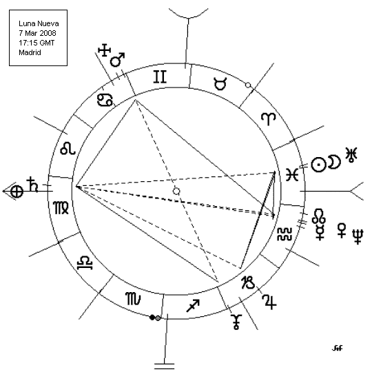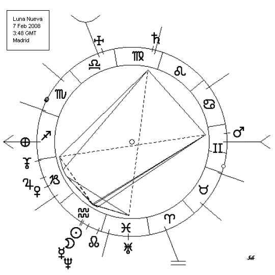 La luna nueva de Acuario da inicio al año nuevo chino, por ello habría que observar este ciclo de tiempo con más detenimiento para esas gentes, algo ajeno a este trabajo que trata de usar las lunaciones como “catalejos” de observación de “espacio-tiempos” en lugares de interés para el lector castellano. Las lunaciones han mostrado mayor influencia en los lugares donde la conjunción del Sol y la Luna o algún planeta es angular. En esta lunación de febrero del 2008, la conjunción del Sol y La Luna es angular en el MC de países como Corea del Norte y del Sur y en el área de Indonesia, también es angular en la zona de Irak, el Yemen, Etiopia y los países del Este africano. Será pues en estos lugares del mundo donde el protagonismo de sus gentes será mayor. Lunación de Acuario para España Esta lunación de febrero, para España, tiene una importancia especial que se centra en los asuntos económicos pues el Stellium formado por la Lunación, Neptuno y Mercurio, se encuentra en la Casa II. Mercurio es uno de los planetas que mayor influencia tiene en los intercambios bursátiles, en esta lunación Mercurio es el “dispositor” del cielo. El Ascendente es Sagitario regido por Júpiter que está en Capricornio, regido por Saturno, que está en Virgo, regido por Mercurio que forma recepción mutua con Saturno y es el máximo dispositor, pues Marte también se encuentra en un signo regido por el mismo Mercurio que está formando una semicuadratura retrógrada y aplicativa con Plutón. La semicuadratura aplicativa de Mercurio retrógrado a Plutón, se puede interpretar como situaciones de miedo, alerta, atención intensa, incluso pánico entre las personas que intercambian valores en la bolsa, especialmente en los países en que se reproduce esta configuración, algo que ocurre en toda Europa, pero no en Rusia, ni tampoco en EEUU. Se puede esperar entonces un mes de febrero con turbulencias bursátiles de primera magnitud, en la que millones de euros pueden desaparecer como por arte de birlibirloque y el espanto puede aparecer en la cara de muchos inversores. Marte en Géminis nos habla de ganancias para los que arriesguen, ganancias para los que compren los días de las mayores bajadas de este Febrero Negro. Este turbulento y escabroso mes de febrero puede tener un final sorprendente, inesperado, original e impensable a primeros de marzo, pues en la lunación del mes de marzo para España, Urano formará una conjunción partil con la luminarias. El mes de marzo será la sorpresa, lo inesperado, lo nunca visto, lo impredecible. Cualquier cosa que se diga sobre los resultados de las elecciones españolas o cubanas resultará inexacta, pues la influencia de Urano, como energía espiritual - ¿porque de que otra manera se podría llamar a este influjo celeste? – incita a evolucionar. El influjo de Urano, como el de cualquier otro planeta, es igual que el de un campo mórfico de memoria, como el que explica Seldrake en un experimento en el que un ratón de EEUU encuentra la salida de un laberinto, al tiempo que ocurre lo mismo en Alemania con otro ratón en un laberinto semejante. Una salida nueva al laberinto de las asociaciones políticas, de las combinaciones posibles, de los malabarismos políticos que causarán sorpresa. Urano tiene mucho que ver con el republicanismo. En mi opinión, la sorpresa puede estar en la influencia emergente del republicanismo, la reaparición evidente y sorprendente de esta forma de entender la política y el poder. TM