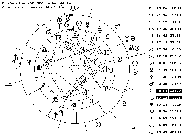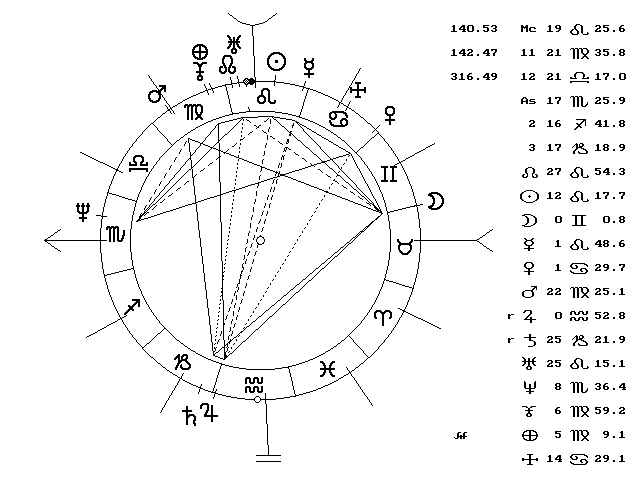 La Luna en la VII en los primeros minutos de Géminis, media Luna aún en Tauro, formando buenos aspectos salvo con Urano, nos muestra a su mujer como una persona inteligente, atractiva y sensual pero con un toque de nervios o rebeldía propio de la acción evolutiva de Urano que la obligará a un “trabajo social o profesional” inesperado, imprevisible o fuera de lo común, como así está siento hasta ahora.