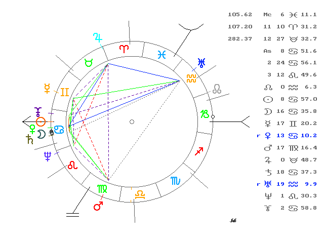 El AS se sitúa al final del signo (es demasiado tarde) de Leo; y la Luna