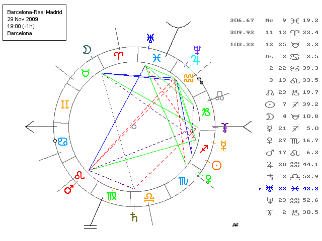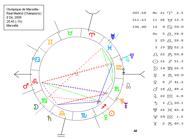 La carta de inicio del 1er partido de Champions de la temporada muestra un equipo local débil, y uno visitante (RM) de juego elegante y eficaz, aunque desaprovechará algunas ocasiones (Júpiter oposición Venus). El Ascendente cardinal (Aries) supone que todo quedará claro en el 1er tiempo [pronóstico 14/Sep/09]. | 0-1: (min. 27) Cristiano R., de falta directa |