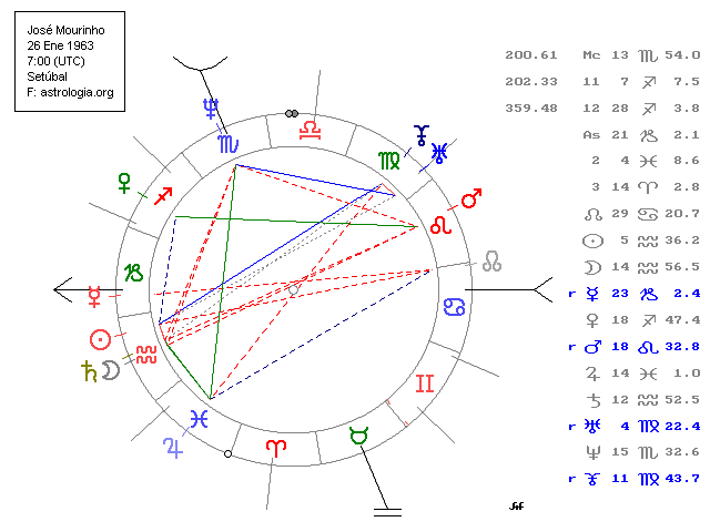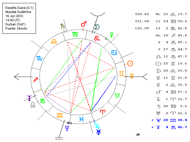 Higuaín ANÁLISIS DE ERRORES: La diferencia de forma entre ambos equipos es demasiado grande, mucho mayor que la diferencia en "dignidad" de los planetas significadores de ambos equipos. El Zaragoza acaba de subir de 2ª división e, inmerso en una mala racha (puesto 18º), acaba de cambiar de entrenador. Además, Saurno, el significador del Z., estaba únicamente mal aspectado. |
